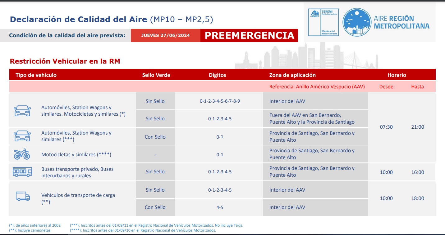 Por su parte, desde la Seremi de Transportes y Telecomunicaciones informaron que "para los automóviles y similares con sello verde, inscritos hasta septiembre de 2011, y para las motocicletas inscritas hasta 2010, rige el calendario permanente de restricción vehicular entre las 07:30 y 21:00 horas”.