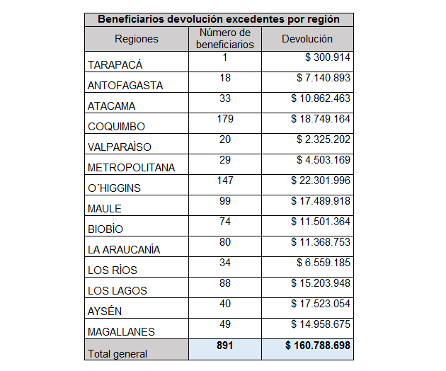La suma asciende a $160 millones, y los beneficiarios son un total de 891 familias de distintas regiones del país. En promedio, las familias reciben una devolución de $180.459.