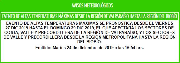 La Dirección Meteorológica de Chile emitió un aviso debido a las altas temperaturas que se registrarán en la zona central desde este viernes 27 hasta el domingo 29 de diciembre.