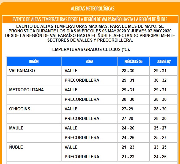 De concretarse el pronóstico, podrían registrarse entre los 21° y 32° tanto en valles como precordillera durante las jornadas del miércoles 6 y jueves 7 de mayo. La Región Metropolitana, en tanto, espera temperaturas mínimas de 28°, mientras que la máxima podría llegar a los 31° durante el jueves.
