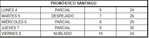 Según el pronóstico del Departamento Meteorológico de Turner, Santiago rondará 30° el miércoles y el jueves. “Este lunes durante la madrugada y la mañana podrían caer precipitaciones en la cordillera metropolitana, es la único de lluvias para esta semana”, adelanta en meteorólogo, Eduardo Sáez.