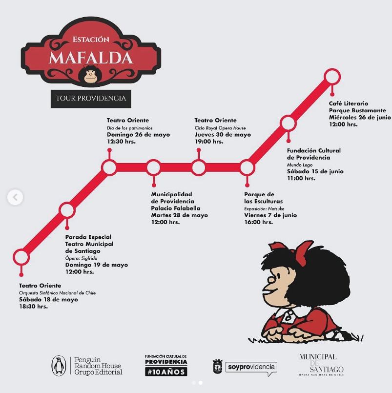 La Fundación Cultural de Providencia en conjunto con la editorial Penguin Random House crearon el evento "#EstaciónMafalda". Un tour que durante todo el mes de mayo y junio hará que Mafalda, la icónica caricatura argentina, recorra la comuna de Providencia.