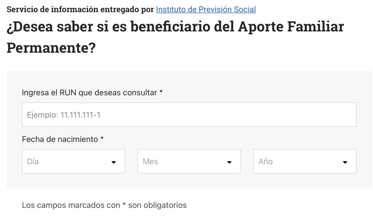 Lee también: Registro Civil anunció que el pasaporte será más barato en Chile a partir de marzoPara saber si podrás recibir el Aporte Familiar Permanente debes ingresar al buscador habilitado por Chile Atiende: Con tu RUT y fecha de nacimiento, el sistema entregará la información solicitada.
