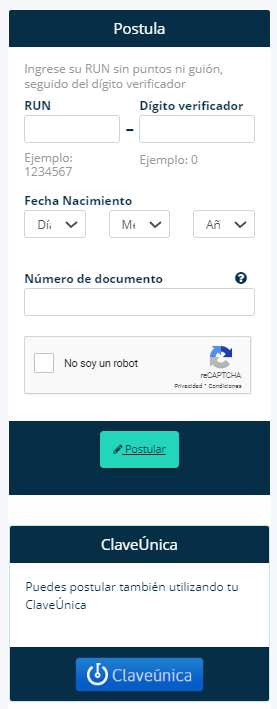 - En la sección de "Postula", ingresar el RUN, fecha de nacimiento y número de documento de la cédula de identidad, o utilizar la Clave Única.