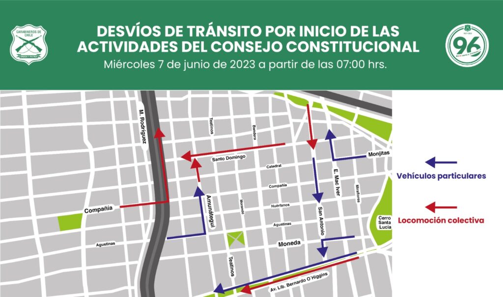 ATENCIÓN a cortes de tránsito en inmediaciones del ex Congreso Nacional en Santiago, por inicio de Consejo Constitucional este miércoles 07/junio. Desvíos se iniciarán a las 20 hrs. de hoy y se irán sumando hasta las 07 hrs. de mañana. Los detalles > https://t.co/ryFDsBqR80pic.twitter.com/NDKSgiwTT1
