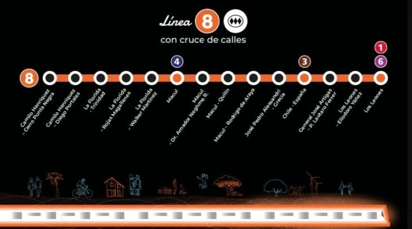 La Línea 8 del Metro de Santiago tendrá 14 estaciones, de las cuales tres de ellas serán de combinación, mientras que el trazado será subterráneo en su totalidad.