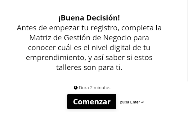 Finalmente, deberás contestar la Matriz de Gestión de Negocio, con el fin de que quienes están encargados de realizar estos talleres conozcan el nivel digital del emprendimiento de la postulante y puedan ayudarte a elegir un taller. Además de rellenar con el nombre completo, RUT, correo y teléfono, el producto o servicio que se vende.