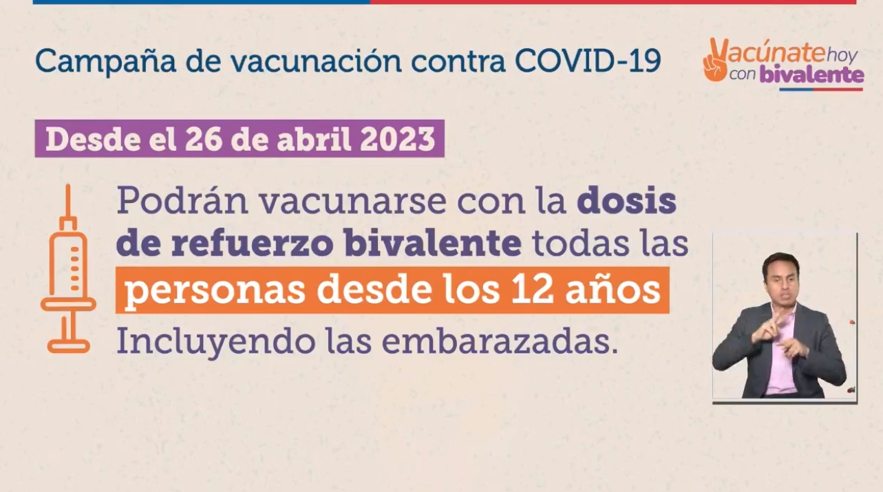 Entre los anuncios, la ministra de Salud, Ximena Aguilera, también indicó que las embarazadas, independiente si presentan comorbilidades, y los mayores de 12 años también podrán recibir la vacuna bivalente contra el coronavirus desde el 26 de abril.