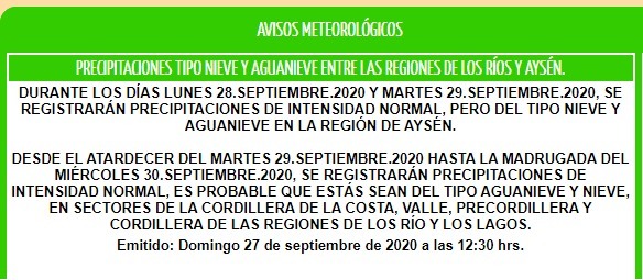 Lee también: Días y horarios: Zoológico Nacional y Buin Zoo reabren esta semana bajo estrictos protocolos sanitariosLa DMC detalla que desde el atardecer del martes 29 de septiembre hasta la madrugada del miércoles 30 de septiembre se registrarán precipitaciones de intensidad normal con la probabilidad que “estas sean del tipo aguanieve y nieve en sectores de la cordillera de la costa, los valles, la precordillera y la cordillera andina en las regiones de Los Ríos y Los Lagos”.
