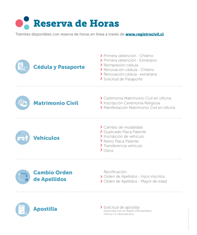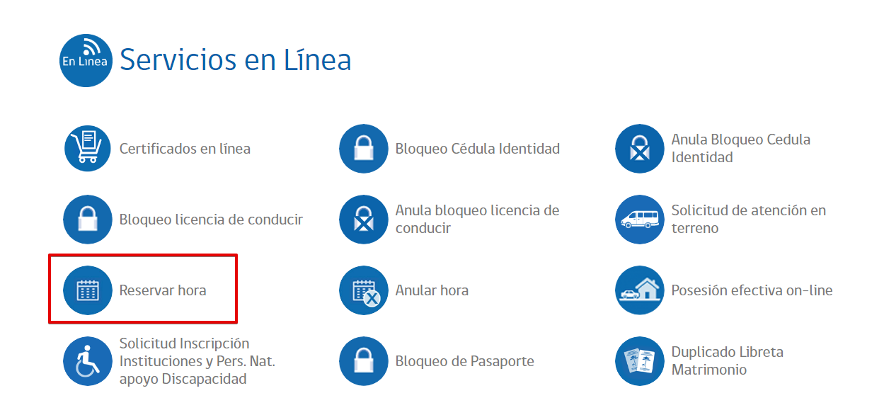 •  Seleccione el trámite que necesite, ya sea cédula de identidad, pasaporte, vehículos, matrimonio, apostilla, acuerdo unión civil, cambio de orden de los apellidos o inscripción religiosa. Podrá reservar la hora en línea poniendo su número de RUN, Nº de serie de documento de identidad, correo electrónico y celular.