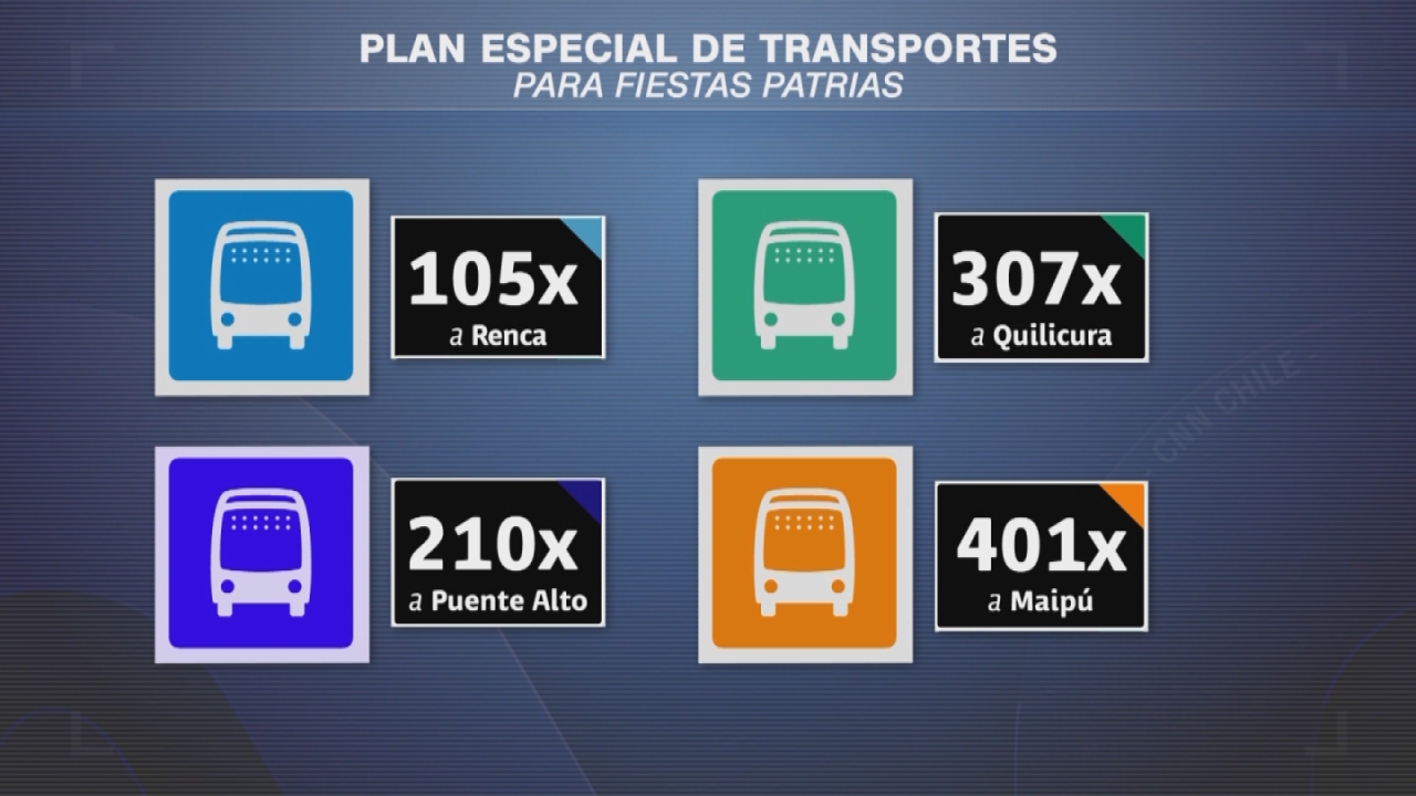 Para el Estadio Nacional se dispuso el reforzamiento de tres servicios: 506, 507 y 516. Junto con esto, se reforzará el tránsito de buses en zonas cercanas a los terminales de buses para el retorno de pasajeros, que se concentrará el día 19 de septiembre. Tren Central también reforzará sus trayectos en estas fiestas.