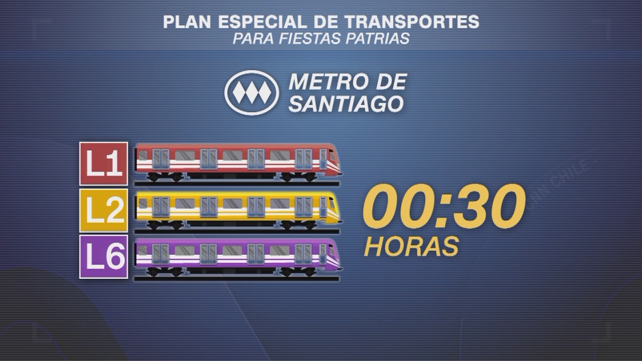 El Metro de Santiago, por su parte, extenderá su horario de servicio hasta las 12:30 AM en las líneas 1, 2 y 6, entre el 14 y 18 de septiembre. Además, se implementará una serie de medidas destinadas a reforzar el funcionamiento en toda la red, lo que incluye una mayor oferta de trenes desde el 14 de septiembre.
