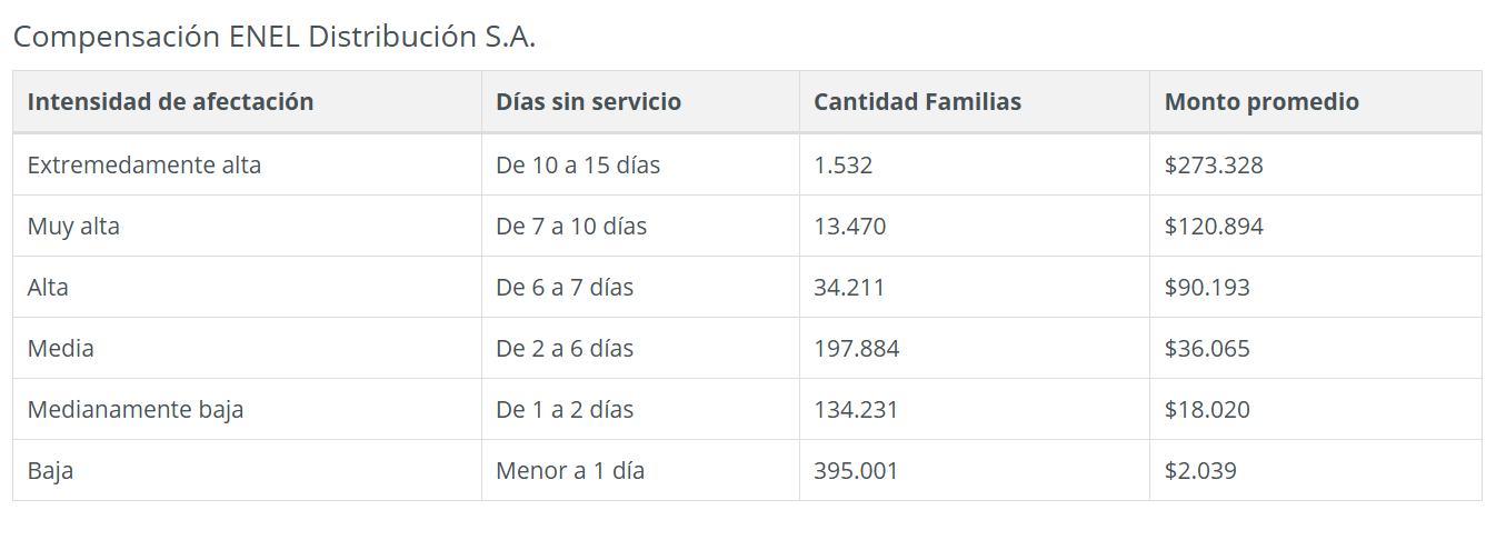 Por ejemplo, las familias que sufrieron interrupciones del suministro eléctrico por parte de ENEL Distribución entre 2 a 6 días recibirán, en promedio $36 mil; y $40 mil en el caso de ENEL Colina.