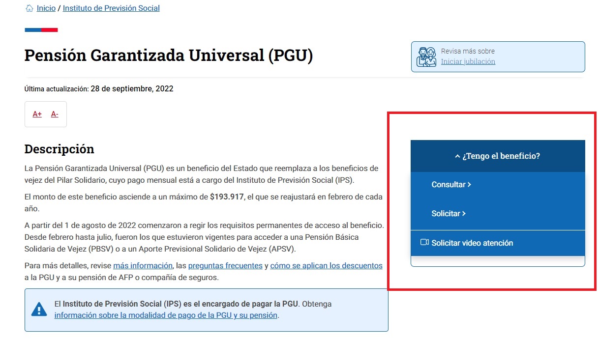 El Instituto de Previsión Social (IPS) está impulsando una nueva iniciativa que permite a los beneficiarios de la Pensión Garantizada Universal (PGU) solicitar el servicio a través de un clic en sus celulares. La solicitud se puede realizar todos los días y a cualquier hora, incluyendo días feriados y fines de semana.