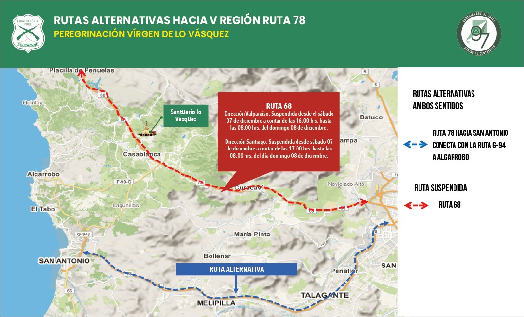Este corte de tránsito se mantendrá hasta las 08:00 horas de este domingo 8 de diciembre, con el fin de permitir la libre y segura caminata de miles de peregrinos que llegarán al Santuario de Lo Vásquez.