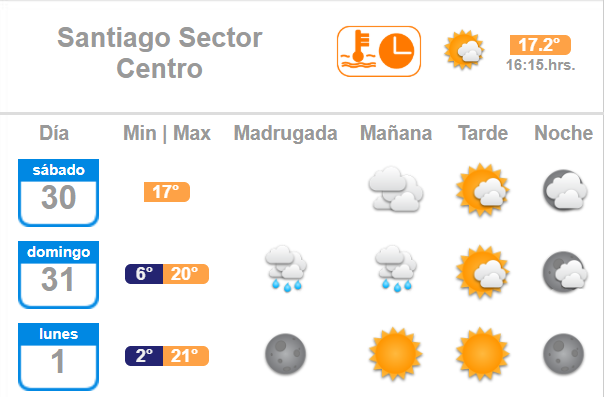 La Dirección Meteorológica de Chile anunció que los chubascos caerían durante la madrugada y mañana de este 31 de mayo en Melipilla, Curacaví, Colina, San José de Maipo y Santiago.