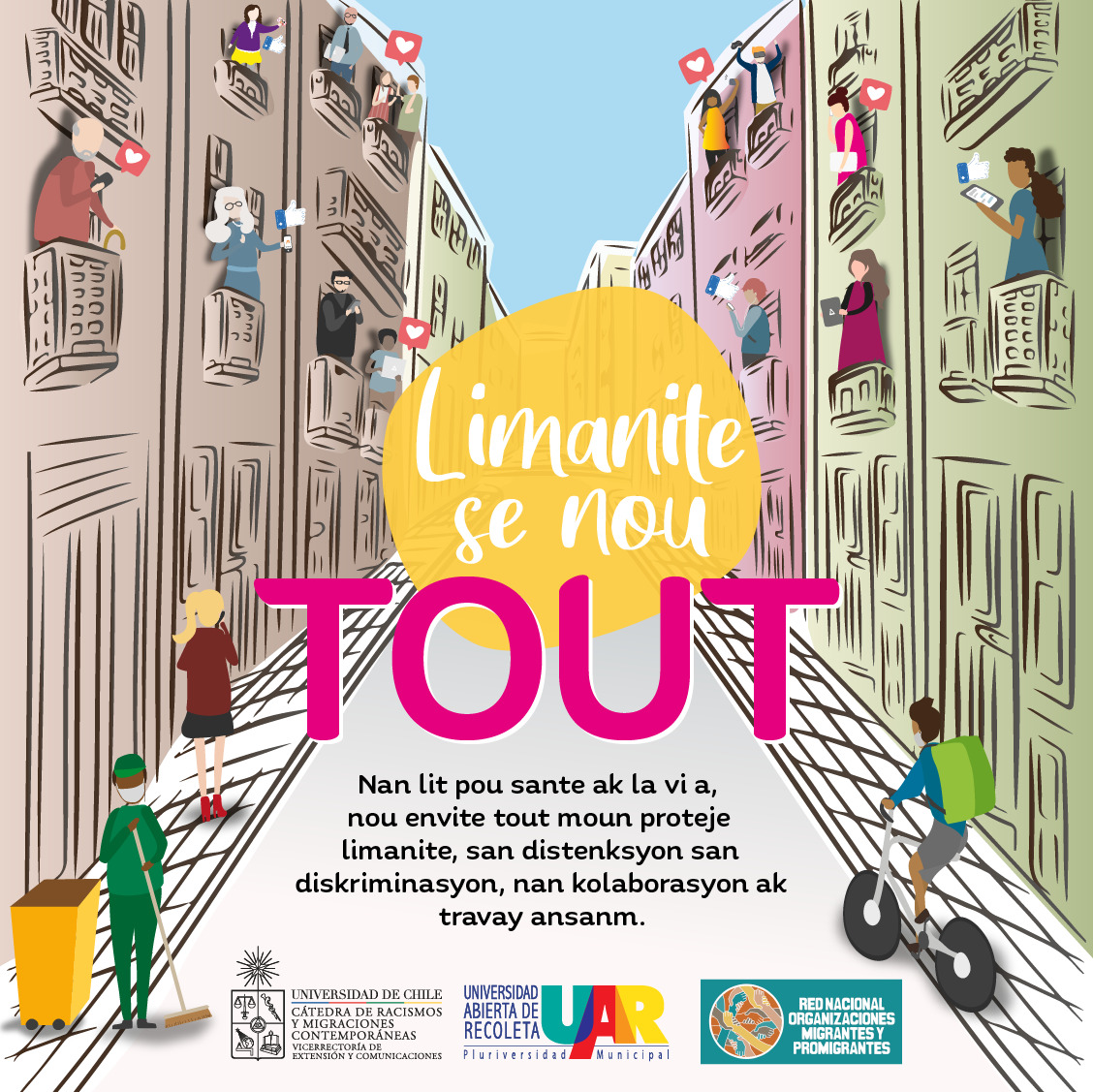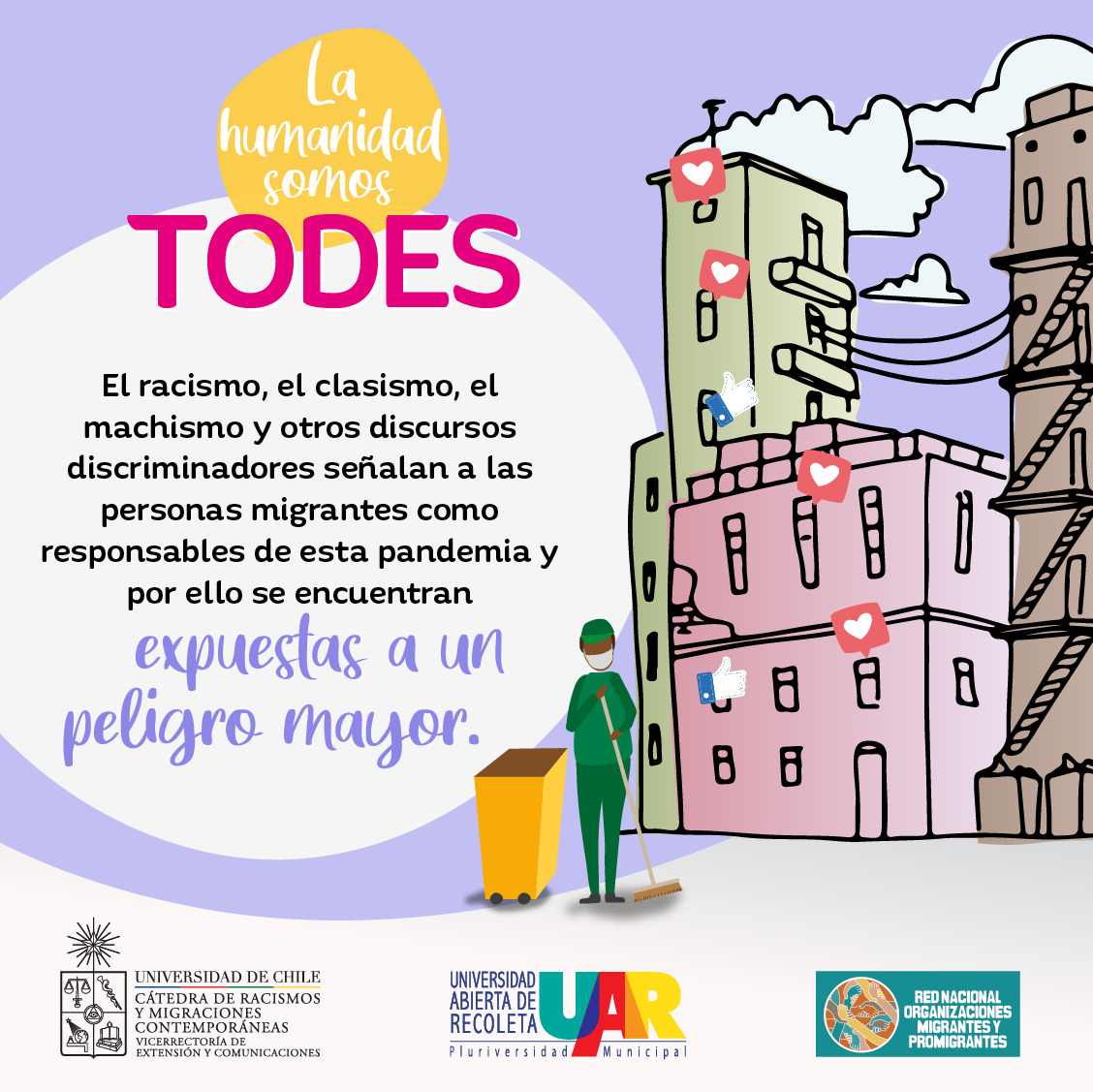 La Universidad de Chile, la Universidad Abierta de Recoleta y la Red Nacional de Organizaciones Migrantes y Promigrantes dieron el vamos a la campaña “La humanidad somos todes”, que por medio de piezas gráficas, material audiovisual y otras estrategias buscará sensibilizar la problemática que atraviesan los migrantes en medio de la emergencia sanitaria, algo que se complejiza por la discriminación y falta de documentos de identidad.