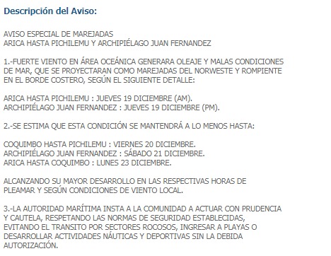 Además del calor, la Armada de Chile anticipó que se registran marejadas provenientes del noroeste en las bahías desde O’Higgins al norte del país. Se esperan olas superiores a 2 metros de altura, por ejemplo, en Valparaíso y sus alrededores. Este fenómeno se extenderá, por lo menos, hasta el lunes 23 de diciembre.