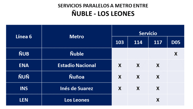 Si este martes te vas a mover entre Tobalaba y Los Dominicos puedes abordar los siguientes servicios paralelos a Metro de Santiago: 401-405-406-407-412-418-421-426-C01-C02 – 405C y C01C.