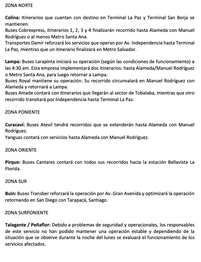 Las siguientes estaciones permanecerán cerradas: Pedro de Valdivia, Baquedano, Santa Lucía, Los Héroes y Unión Latinoamericana. Todo el resto de la red se mantendrá cerrada.