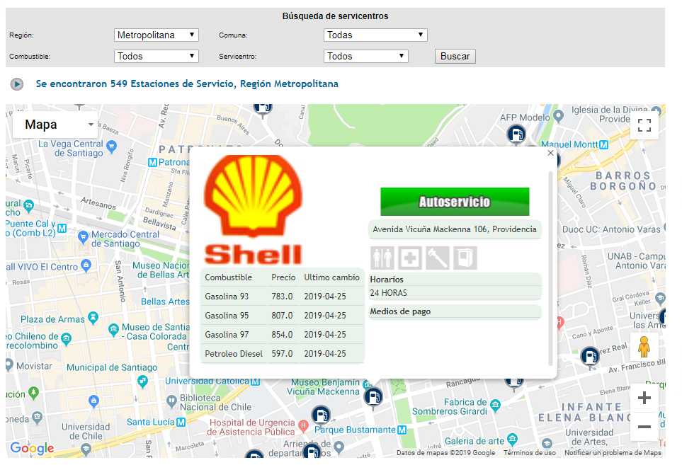 El sitio permite filtrar la búsqueda utilizando una visualización georreferenciada, por regiones y comunas. Además, muestra todas las estaciones de servicio que estén operando.