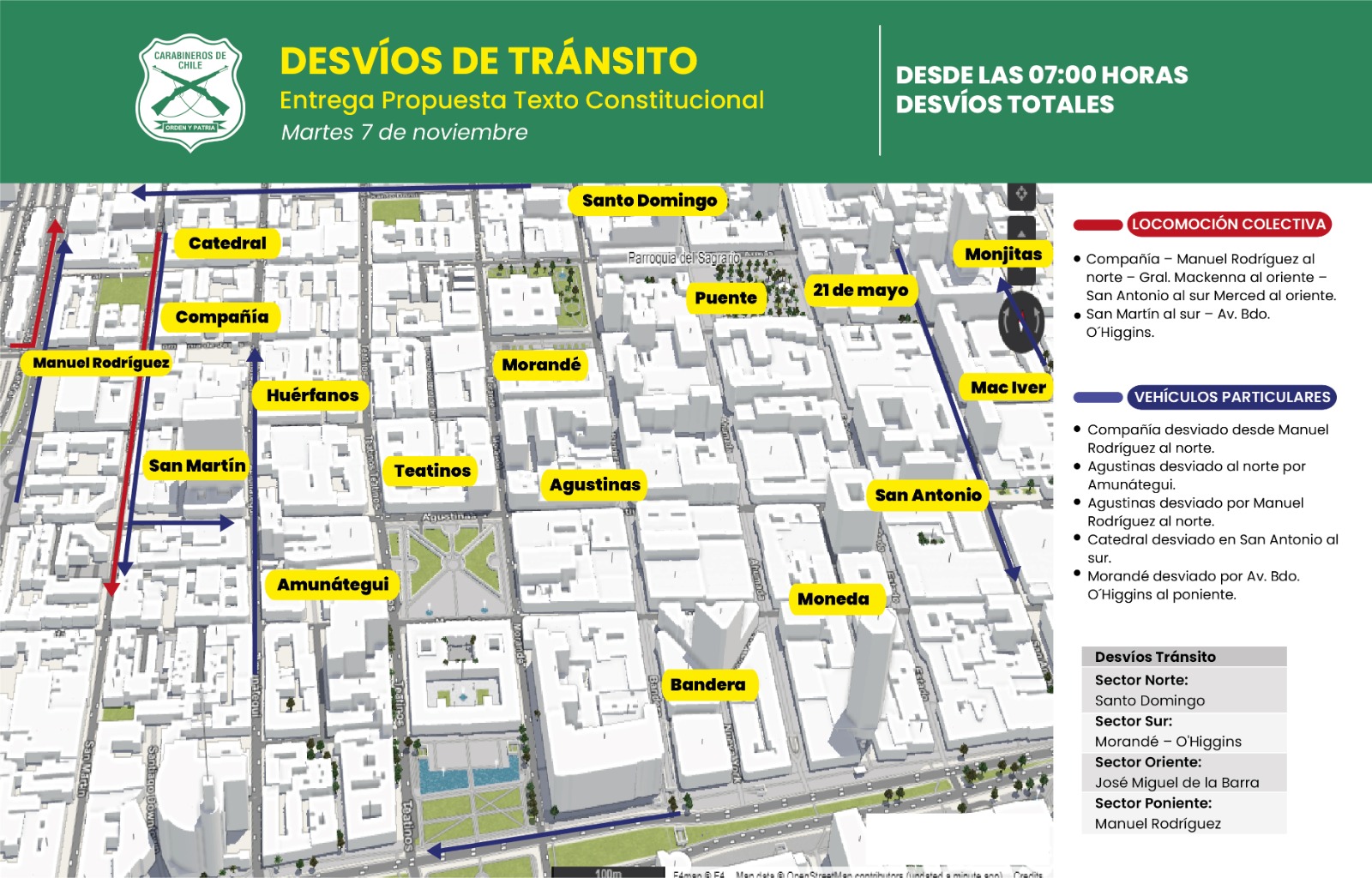 Este martes 7 de noviembre a partir de las 07:00 horas comenzarán los desvíos de tránsito por la ceremonia de entrega de la propuesta de nueva Constitución al presidente de la República, Gabriel Boric. La convocatoria está programada en la palacio del ex Congreso Nacional, ubicado en el corazón de Santiago entre las calles Bandera, Compañía, Catedral y Morandé. Por tal motivo, Carabineros informó en detalle las calles que verán interrumpido el tránsito de vehículos y transporte público a propósito del evento del que participarán las más altas autoridades del país. "Estos desvíos se implementarán mañana desde las 07:00 horas y esto debería durar aproximadamente hasta las 10:30 horas", puntualizó el mayor Rodrigo Melo, de la Prefectura Tránsito y Carreteras.