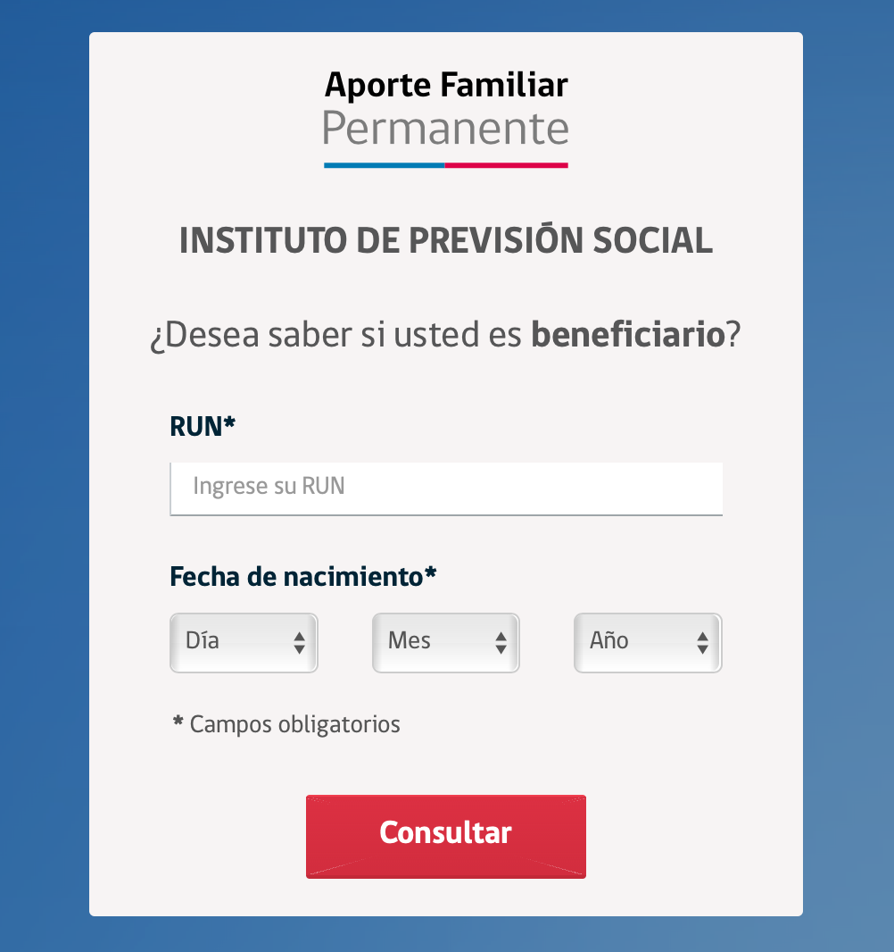 Para conocer si este aporte le fue asignado y cuál es su lugar de pago, se debe ingresar al sitio www.aportefamiliar.cl, donde se debe indicar el RUT y la fecha de nacimiento.