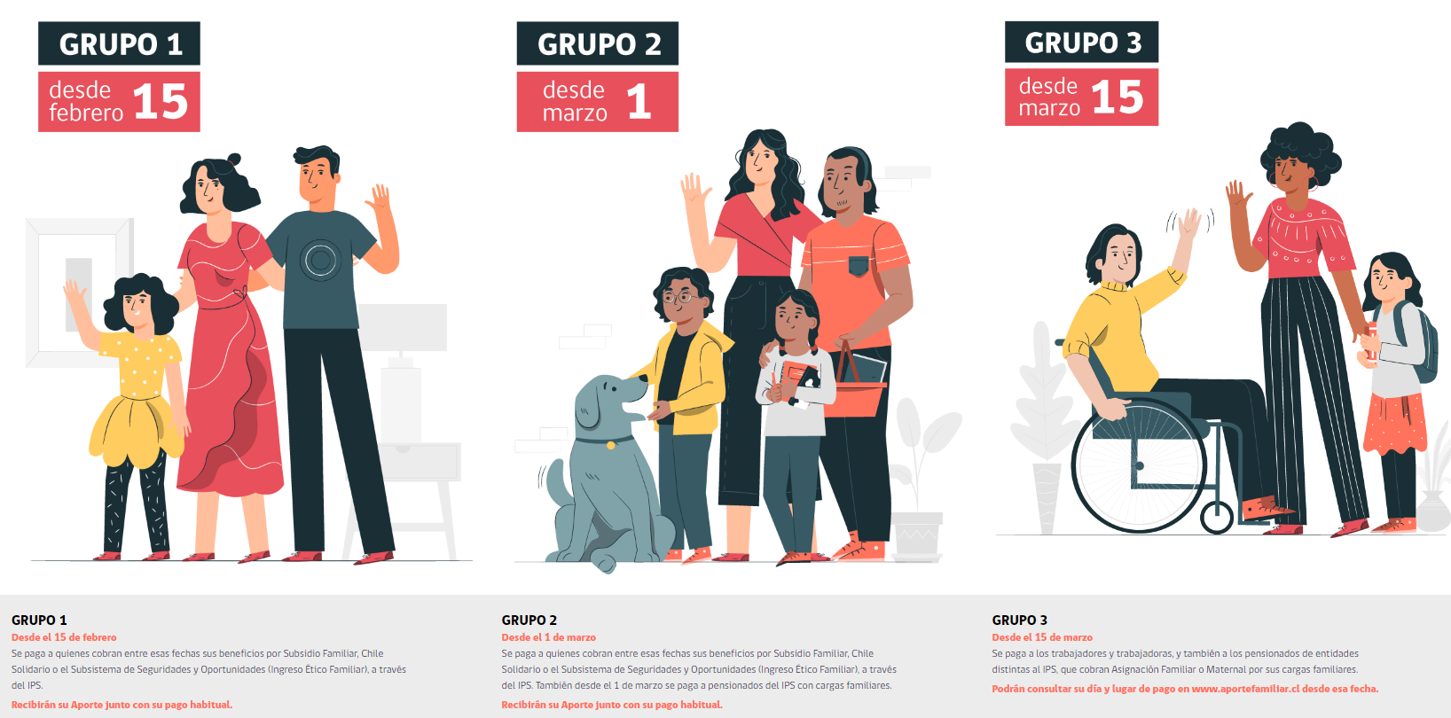 En total son tres pagos del Aporte Familiar Permanente, a tres grupos, cuyo fecha de entrega depende del día del mes en que se reciben algunos bonos o ayudas estatales. Un monto de $52 mil pesos que puede ser por carga familiar o para todo el grupo que vive en una casa.
