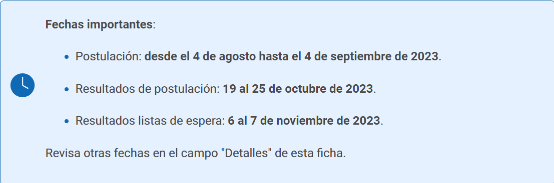 • 17 y el 24 de noviembre: Etapa complementaria para todas las personas que no hayan postulado durante el período principal, no quedaron asignados en un establecimiento o fueron rechazados.