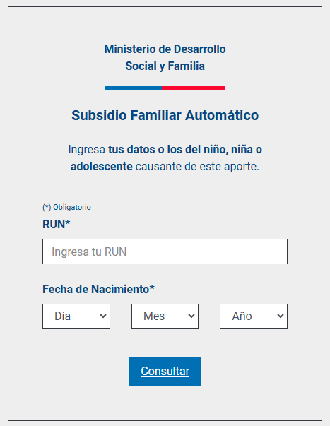Puedes conocer si te corresponde el Subsidio Único Familiar en este enlace. Para ello, debes rellenar con tus datos o los del niño, niña o adolescente causante del aporte.