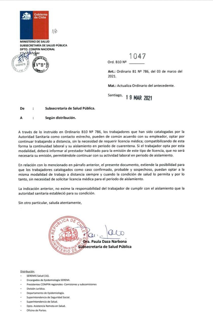 Así lo especificó una circular de la Subsecretaria de Salud Pública fechada al 19 de marzo del 2021.