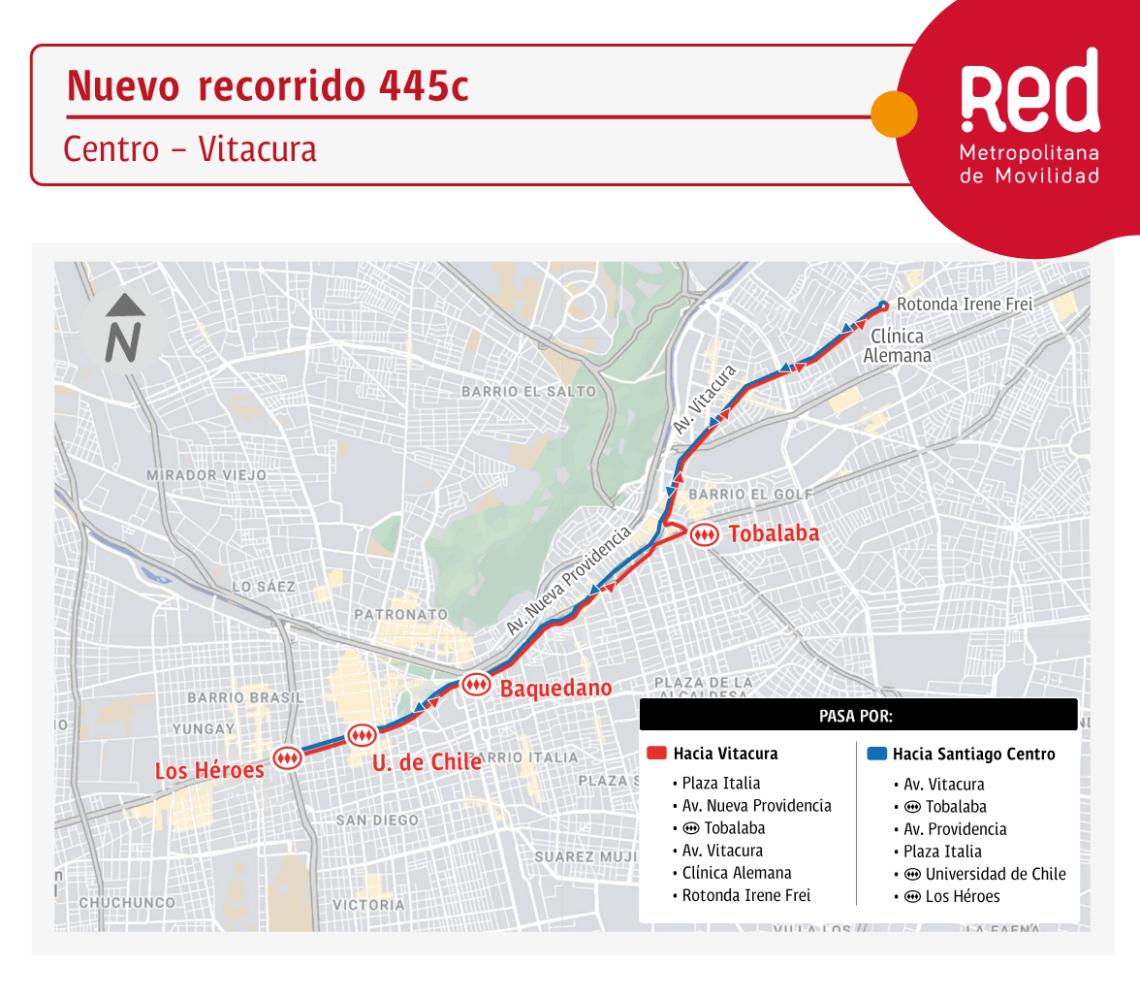 conectará el centro de Santiago con la comuna de Vitacura. Este bus pasará por las estaciones de Metro Baquedano y Tobalaba.