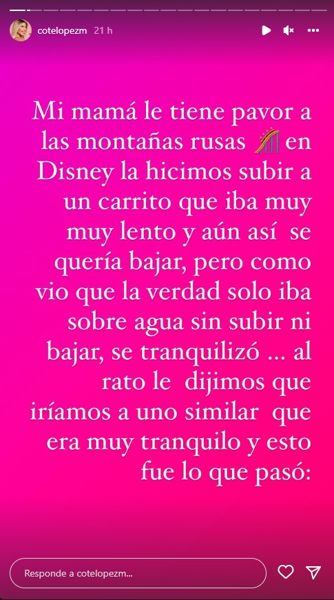 “Mi mamá le tiene pavor a las montañas rusas. En Disney la hicimos subir a un carrito que iba muy muy lento y aún así se quería bajar, pero como vio que sólo iba sobre agua sin subir ni bajar, se tranquilizó”, escribió López a modo de contexto.