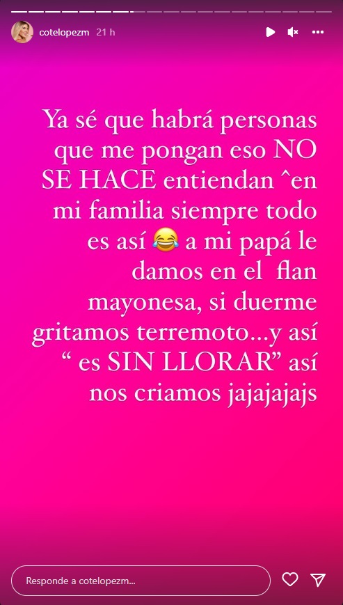 “A mi papá le damos (colocamos) en el flan mayonesa, si duerme gritamos ‘terremoto’ y así. Es sin llorar, así nos criamos, jaja”, cerró.