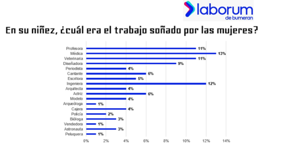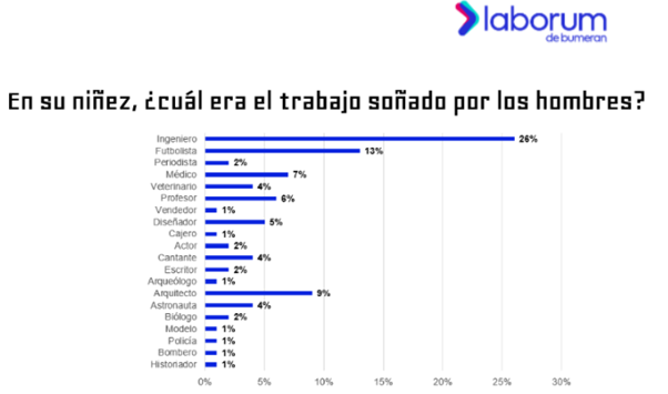 El estudio también indagó en los trabajos soñados de los encuestados según su género. Entre las mujeres, los sueños más comunes durante la niñez incluían convertirse en médicas (13%), ingenieras (12%), profesoras (11%) y veterinarias (11%). Por otro lado, los hombres aspiraban principalmente a ser ingenieros (26%), futbolistas (13%) o arquitectos (9%). Estas aspiraciones reflejan los intereses tradicionales de cada grupo en esa etapa de la vida, antes de que los factores externos o los cambios personales influyeran en sus decisiones profesionales actuales