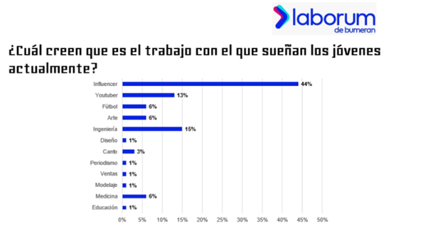 En cuanto a los trabajos soñados por los más jóvenes hoy en día, las preferencias han cambiado. Según el estudio, el 44% de los adultos cree que los niños de hoy aspiran a ser influencers, una carrera que refleja las nuevas tendencias digitales, mientras que el 13% menciona la carrera de YouTuber.