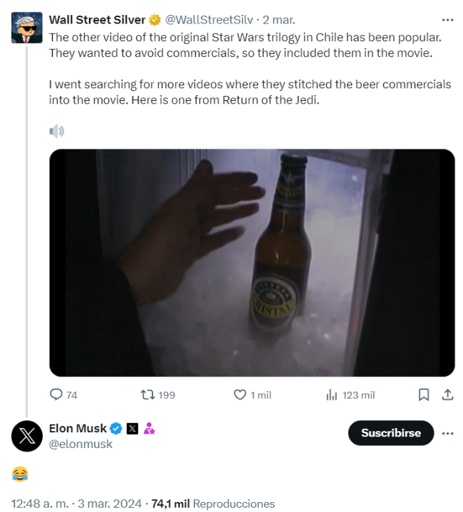 Pero, ¿cómo llegó dicha cerveza nacional a la famosa cinta? Fueron montajes donde se mostraba a los personajes tomando las latas, tal y como si fuera parte de la película original. Los momentos se eligieron para pasar justamente después a comerciales de esta misma marca. Y aunque la idea tuvo un éxito enorme, no fue por mucho tiempo. Aunque ahora los videos volvieron a la vida y sacan risas entre los usuarios en la redes sociales. Incluso, el propio empresario Elon Musk, dueño de la red social X (antes llamada Twitter) comentó sobre la viral temática con un emoticón, el que expresó claramente una carcajada frente al antiguo registro.Around 2003 in Chile, when the original trilogy of Star Wars began airing on television there, they did this funny thing to avoid cutting to commercial breaks. They stitched the commercials into the films themselves. Here is one of them, with the English dub added in. pic.twitter.com/wC7N2vPNvv
