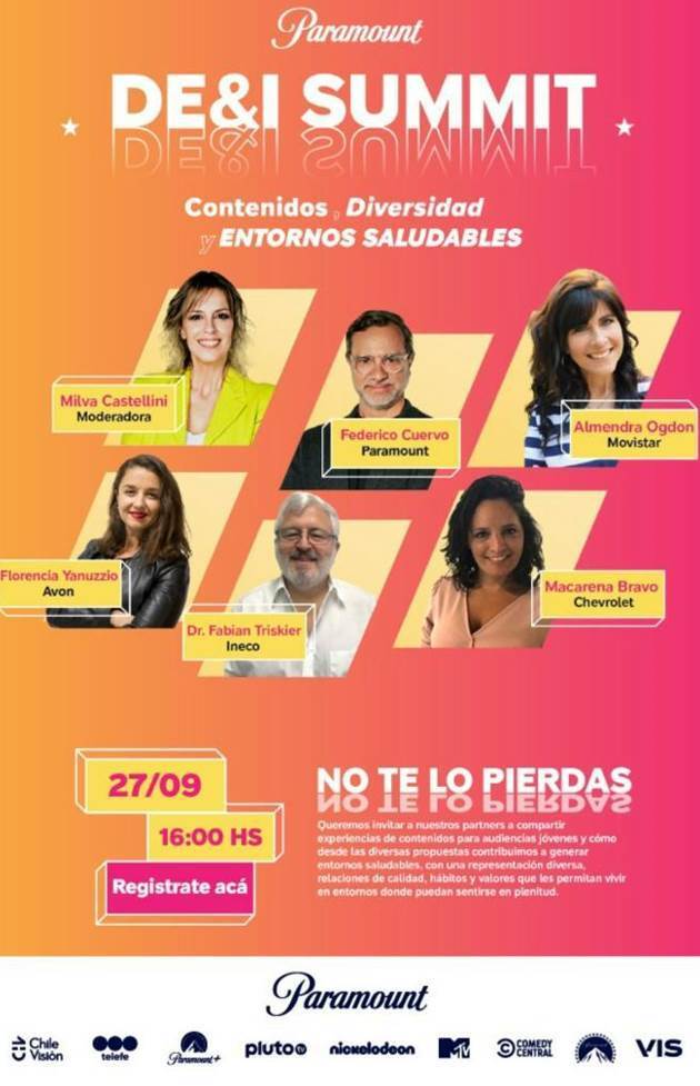 La invitación al segundo Paramount Summit DE&I 2022, está abierta para quienes estén interesados en reflexionar sobre experiencias de contenidos para audiencias jóvenes y cómo desde estas propuestas se puede contribuir a generar entornos saludables, con una representación diversa, con relaciones de calidad, con hábitos y valores que les permitan vivir en entornos donde pueden sentirse en plenitud y donde se consideren las necesidades y problemáticas que los atraviesan.
