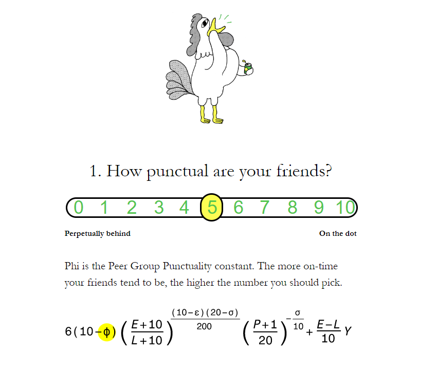 Si quieres realizar el test, puedes hacer clic en este link y bajar hasta el apartado que indica "What time to arrive at a party: A calculator", o presionar en la siguiente imagen. Hay que considerar que en ambos casos se debe completar el cuestionario y, al terminar, hay que apretar en el botón "Calculate".