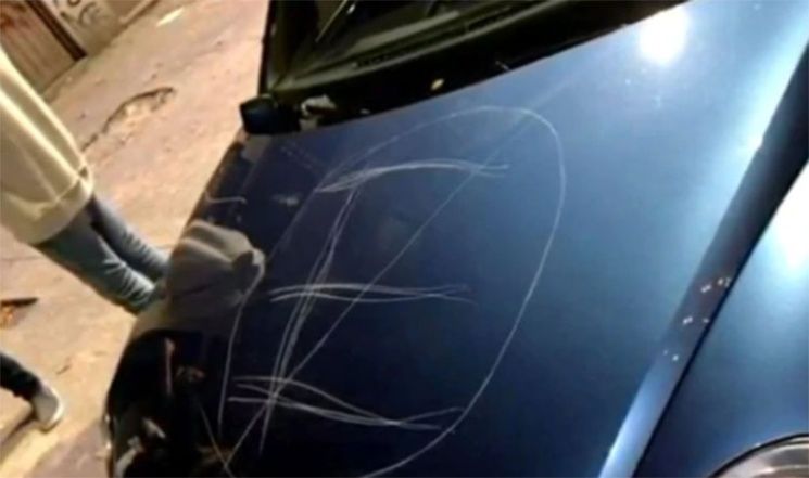 Este ofuscado hombre le pegó patadas y combos al auto, rompiendo algunas de sus partes. No contento con eso, agarró una llave le rayó en el capó el signo de “No Estacionar”.