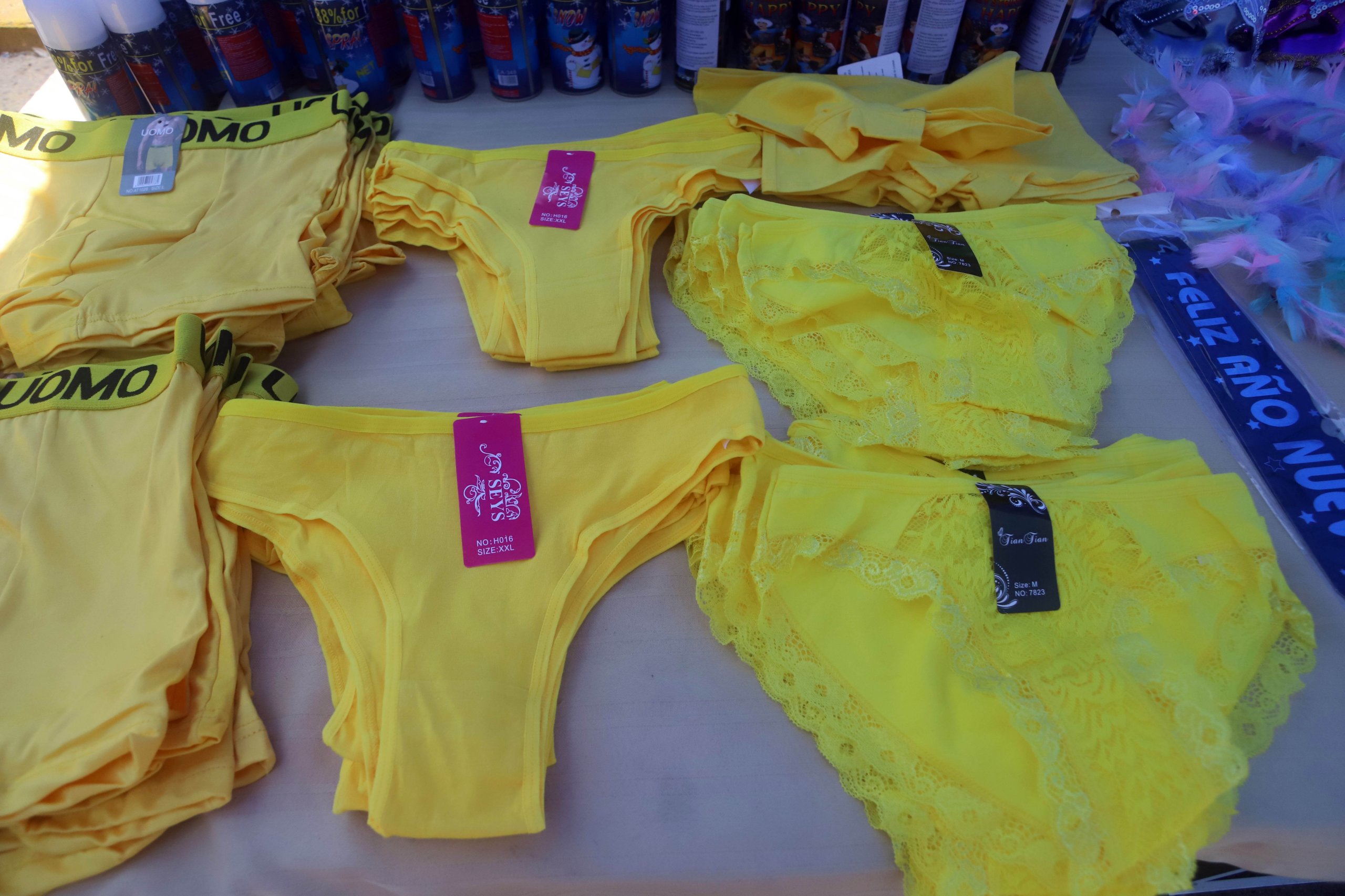 El color de la ropa interior debende de la intención de cada persona. Los más comunes son amarillo para atraer abundancia y prosperidad y rojo para el amor y la pasión.