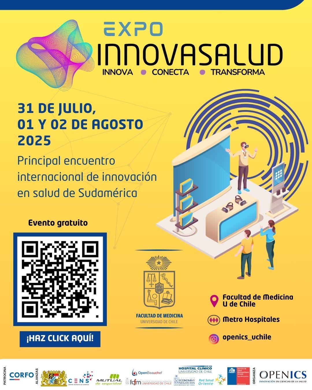 Del 31 de julio al 2 de agosto, se llevará a cabo la Expo Innova Salud en la facultad de Medicina de la Univeridad de Chile, ubicada en Metro Hospitales (Línea 3).
