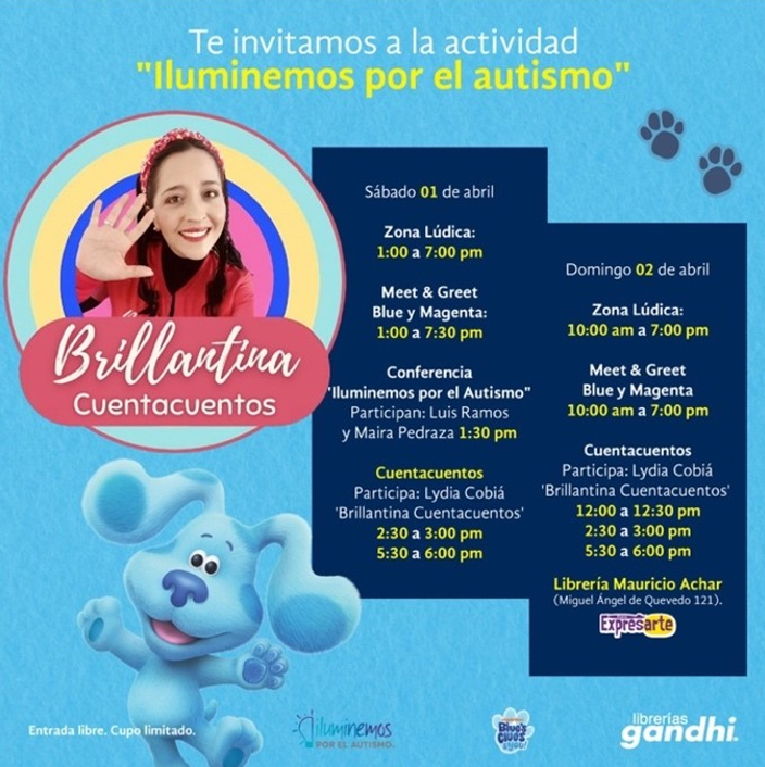 El sábado 1 de abril de 5.30pm a 8:30pm se llevaron a cabo distintas actividades incluyendo una charla con María Paz Salinas, terapeuta ocupacional y Coordinadora Clínica TOIT, para hablar sobre la concientización del autismo, seguido de juegos educacionales y actividades didácticas y cerrando con un M&G de Pistas de Blue y Tu, con nuestra querida cachorra.
