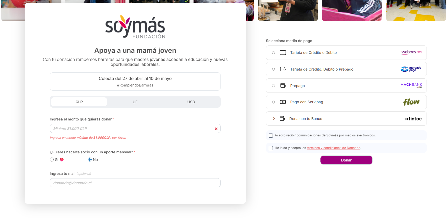 La campaña se desarrollará entre el 27 de abril y el 10 de mayo con el hashtag #RompiendoBarreras. Para realizar tu donación debes ingrsar directamente a la página web www.soymas.cl.