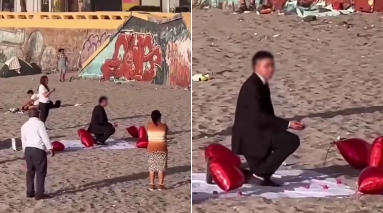 Así, mientras la persona estaba en plena vía pública y a vista de todos en una playa de la zona sur de la ciudad, un hombre vestido de terno se preparaba para pedir matrimonio a su prometida.