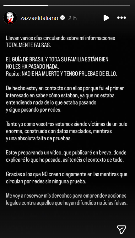Tras la polémica, Zazza el Italiano compartió un comunicado en su cuenta de Instagram aclarando la información sobre el guía de turismo.