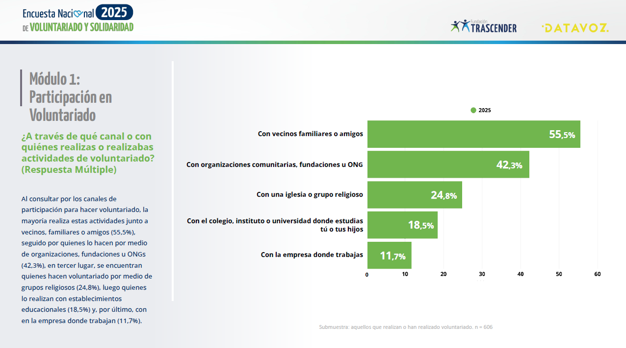En cuanto a los lugares donde más se realiza esta acción, el 55,5% lo hace a través de grupos informales de vecinos, familiares o amigos, un 18,5% más que el año anterior y el 42,3% participa a través de organizaciones formales, fundaciones u ONGs.