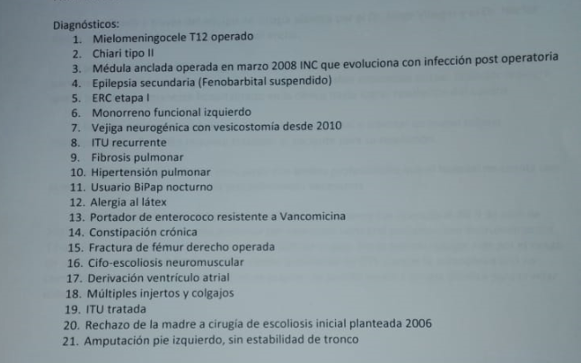 Además de todo lo que terrible por lo que ya ha pasado, la madre de Hugo Navarro confidenció que tiene otras enfermedades: fibrosis quística, hipertensión pulmonar -por lo que en las noches debe usar ventilación mecánica; epilepsia secundaria, Chiari tipo II, alergia al látex y vejiga Neurogénica con vesicostomía (implica incontinencia urinaria).
