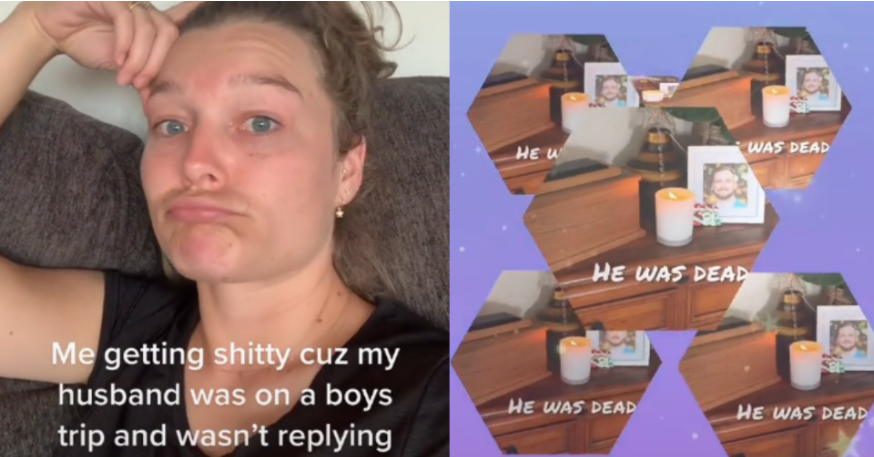 En el video que compartió, se ve cómo realiza muecas mientras le acompaña un texto en el que señala "me estoy enojando porque mi esposo estaba en un viaje de chicos y no me respondía", pero en la transición se muestra la imagen de su esposo junto a una vela junto a la leyenda "estaba muerto".