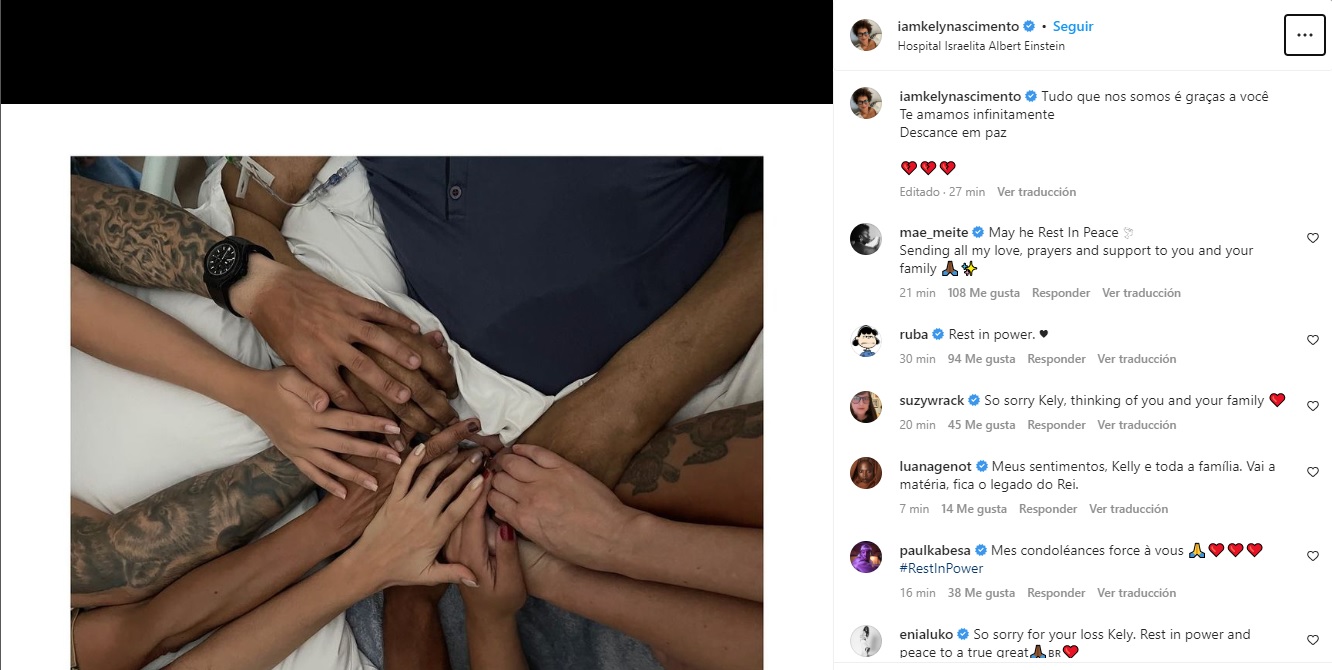 Hace un par de días, Kely había compartido una foto en sus redes sociales abrazando a Pelé con el mensaje: "Seguimos aquí", mientras lo acompañaba en el hospital Judío Albert Einstein, en Sao Paulo.